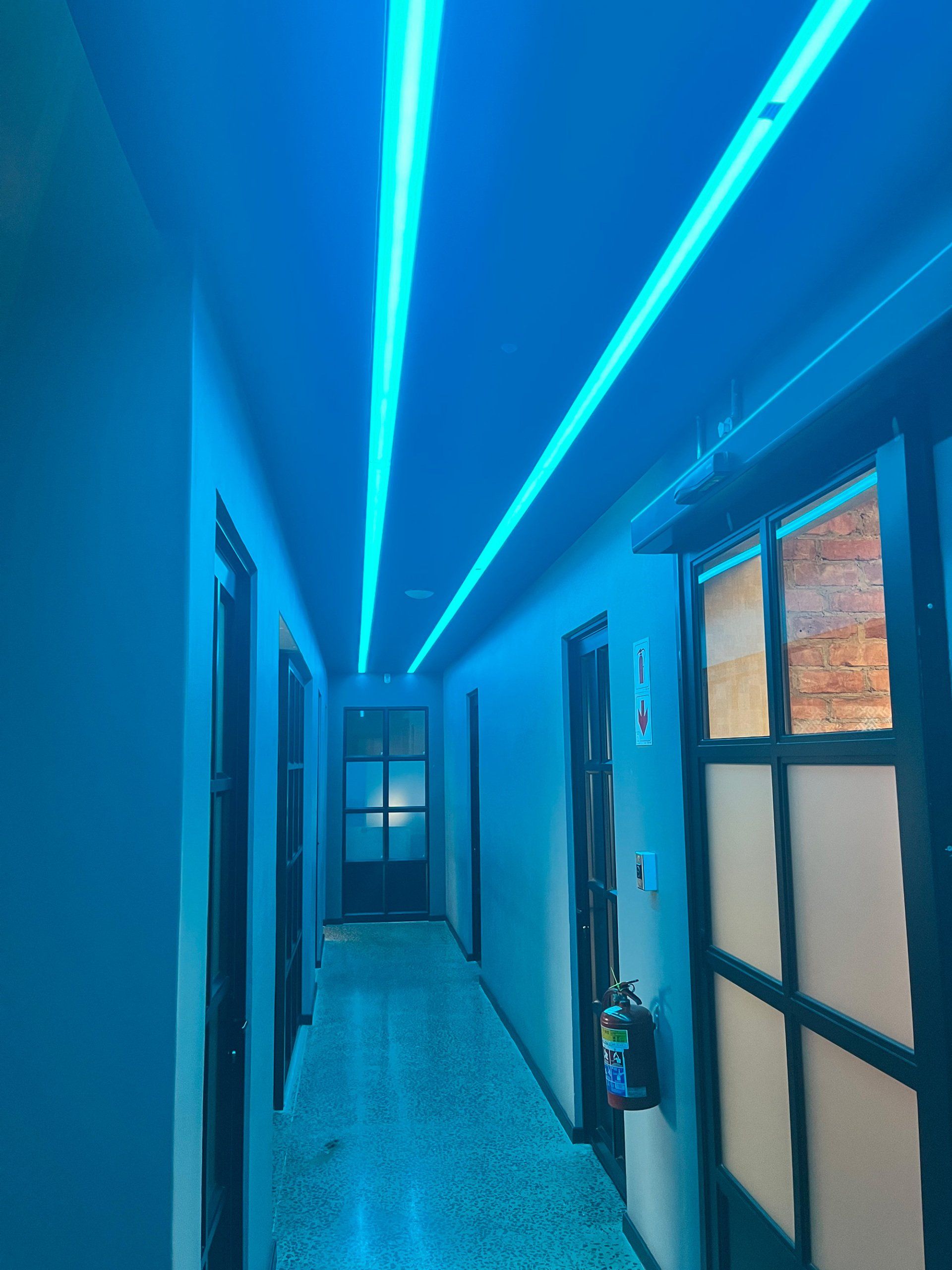 Von der RGBW-Beleuchtung im Korridor bis zur Steuerung der traditionellen Beleuchtung über ein DALI-Relais beweist dieses Büro, dass Blu2light zu allem fähig ist!