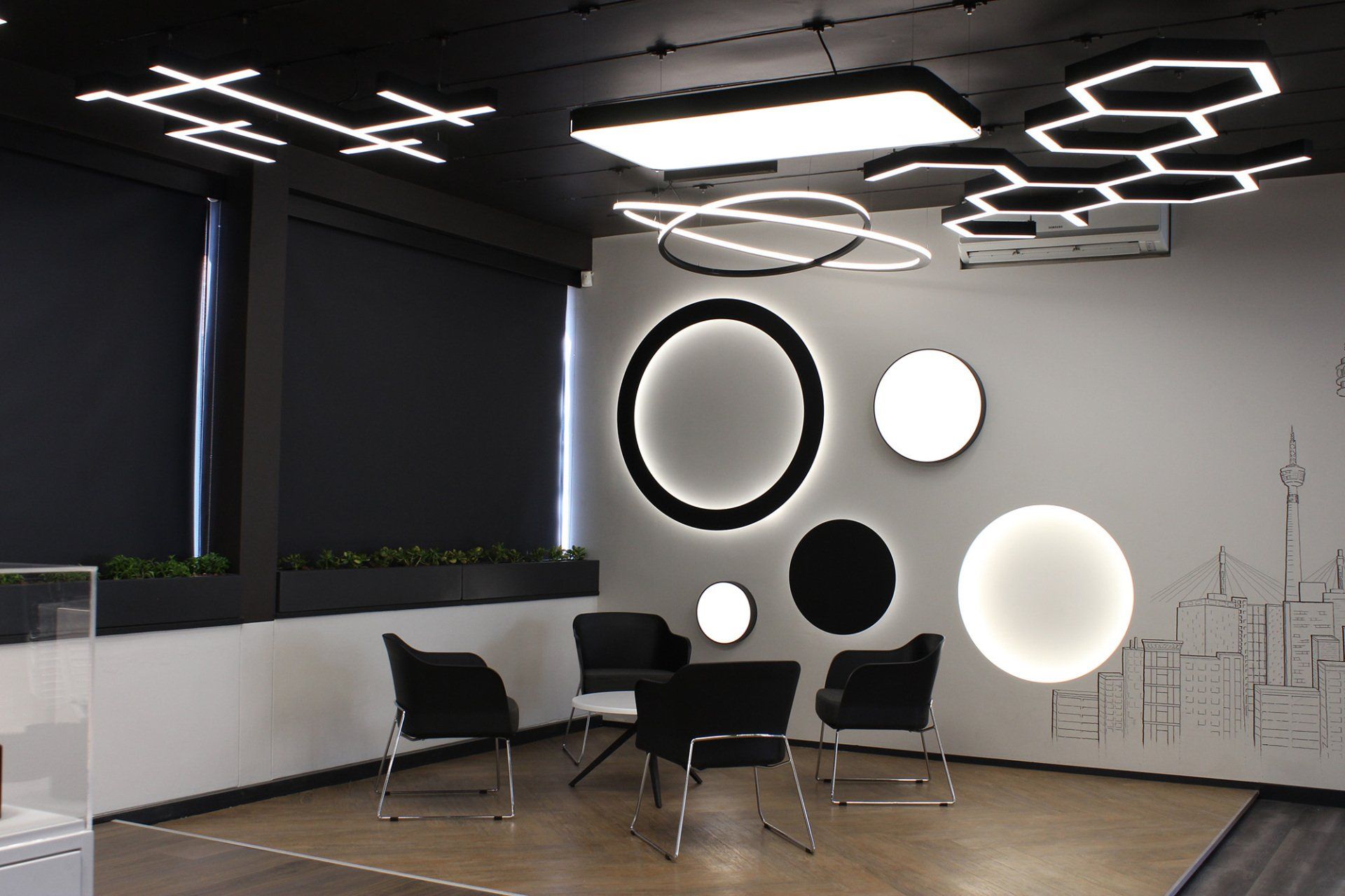 Von dem Moment an, in dem man die Eingangstür des Unternehmens öffnet, stiehlt Blu2light die Show, indem es jedes Downlight in der Wartehalle in einer Sequenz aktiviert. Dieser James-Bond-Effekt setzt den Rest des Büros in Szene, da der Sitzungssaal und die Büroräume mit einer einstellbaren weißen, dunklen Beleuchtung ausgestattet sind. Die Beleuchtung im Büro folgt einem Tagesrhythmus, bei dem das Wohlbefinden der Mitarbeiter im Vordergrund steht.